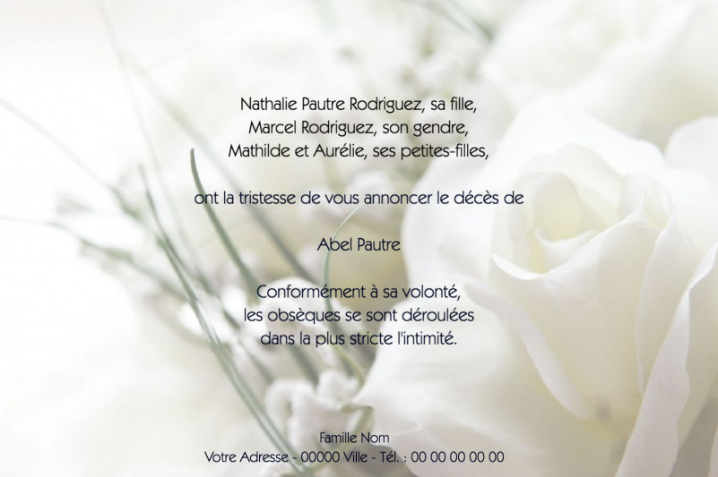 Description : personnalisez rapidement et facilement en ligne le faire-part de décès "gerbe fleur" - faire-part de deuil 10 x15 cm - Enveloppes comprises - livraison offerte France Métropolitaine.