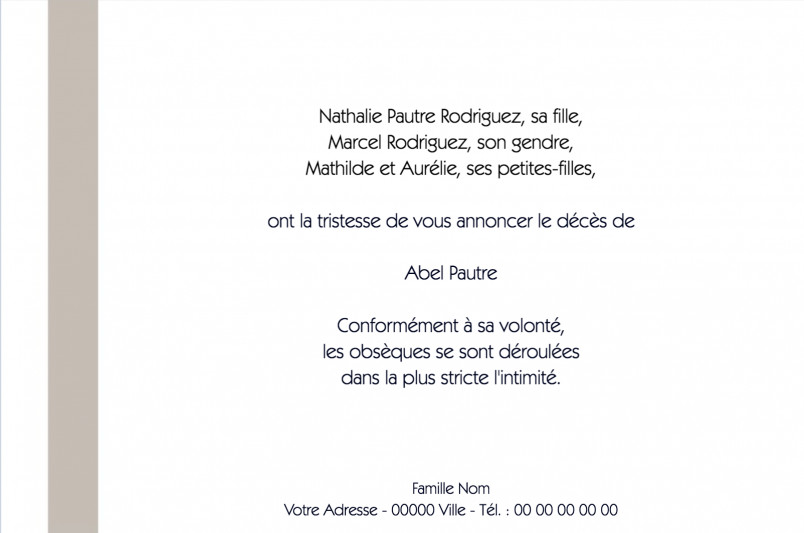 personnalisez rapidement et facilement en ligne le faire-part de décès "bandeau gris" - faire-part de deuil 10 x15 cm - Enveloppes comprises - livraison offerte France Métropolitaine