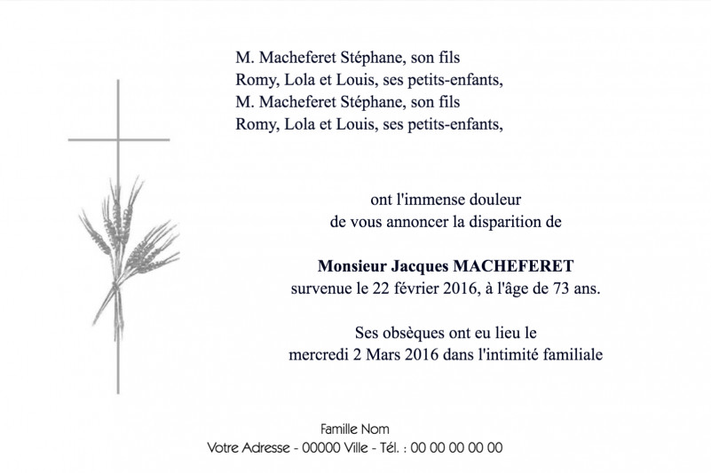 personnalisez rapidement et facilement en ligne le faire-part de décès "blé avec croix chrétienne" - faire-part de deuil 10 x15 cm - Enveloppes comprises - livraison offerte France Métropolitaine
