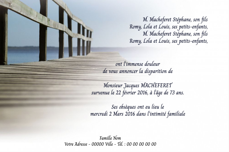 personnalisez rapidement et facilement en ligne le faire-part de décès "accostage" - faire-part de deuil 10 x15 cm - Enveloppes comprises - livraison offerte France Métropolitaine