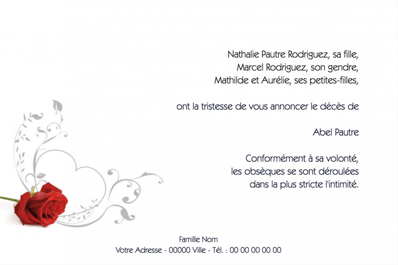 personnalisez rapidement et facilement en ligne le faire-part de décès "rose avec coeur" - faire-part de deuil 10 x15 cm - Enveloppes comprises - livraison offerte France Métropolitaine
