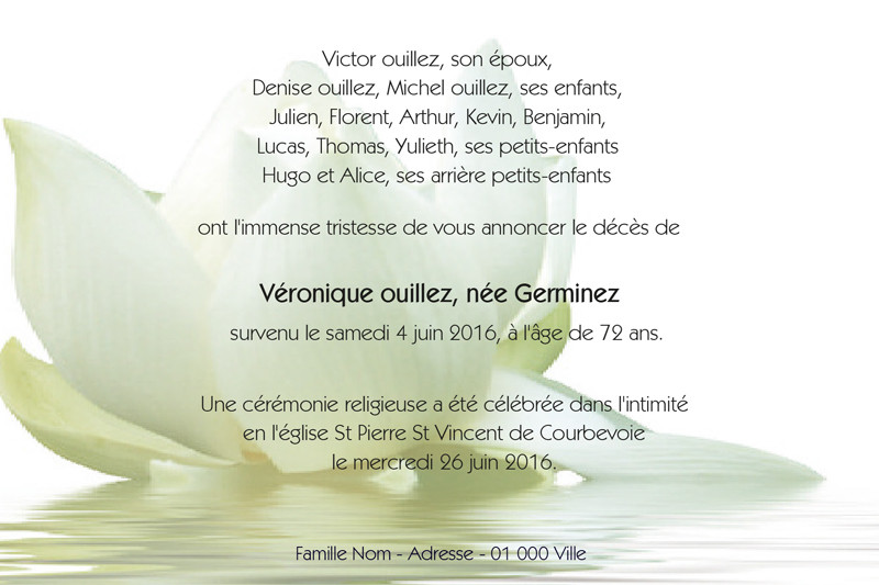 personnalisez rapidement et facilement en ligne le faire-part de décès "lotus" - faire-part de deuil 10 x15 cm - Enveloppes comprises - livraison offerte France Métropolitaine
