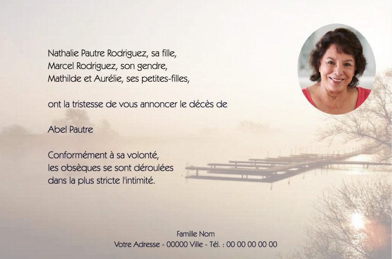 personnalisez rapidement et facilement en ligne le faire-part de décès "Etang avec photo" - faire-part de deuil 10 x15 cm - Enveloppes comprises - livraison offerte France Métropolitaine