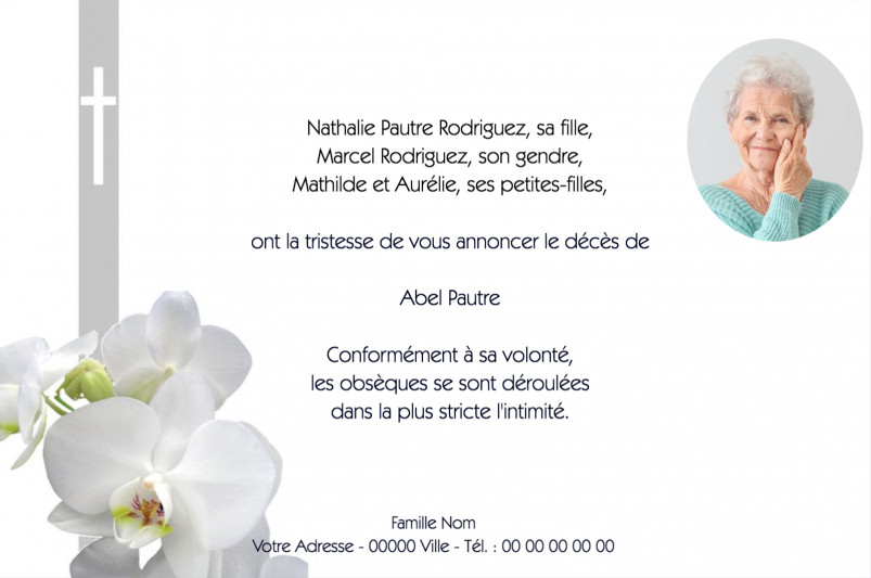 personnalisez rapidement et facilement en ligne le faire-part de décès "orchidée blanche avec croix chrétienne et photo" - faire-part de deuil 10 x15 cm - Enveloppes comprises - livraison offerte France Métropolitaine